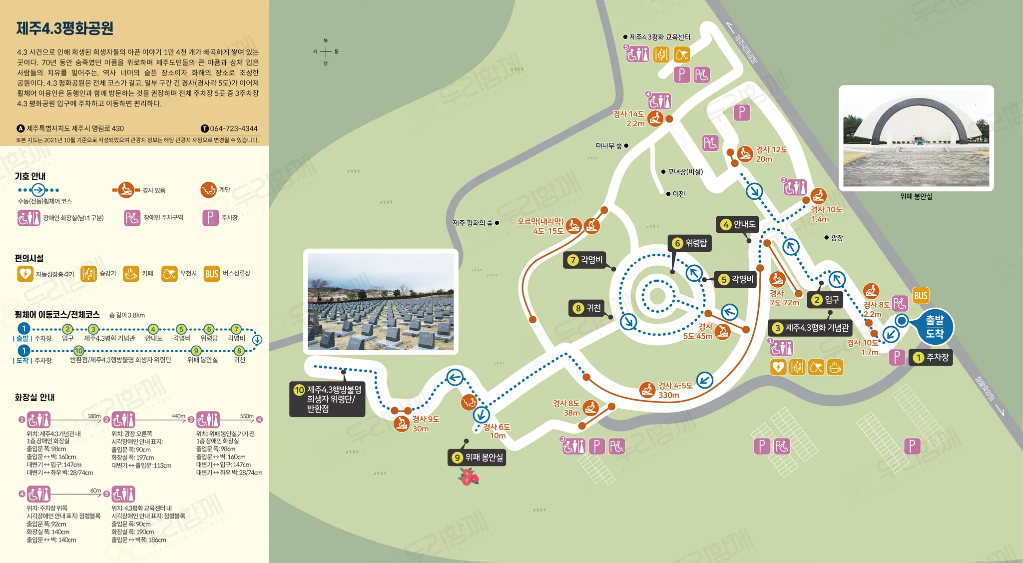 제주4.3평화공원 주차장 → 입구 → 제주4.3평화 기념관 → 안내도 → 각명비 → 위령탑 → 각명비 → 귀천 → 위패 봉안실 → 제주4.3행방불명 희생자 위령단(반환 지점) → 주차장