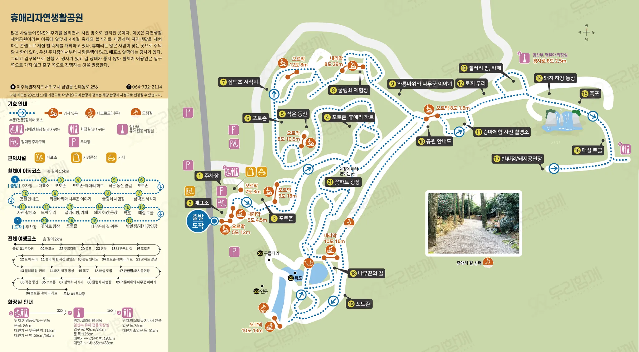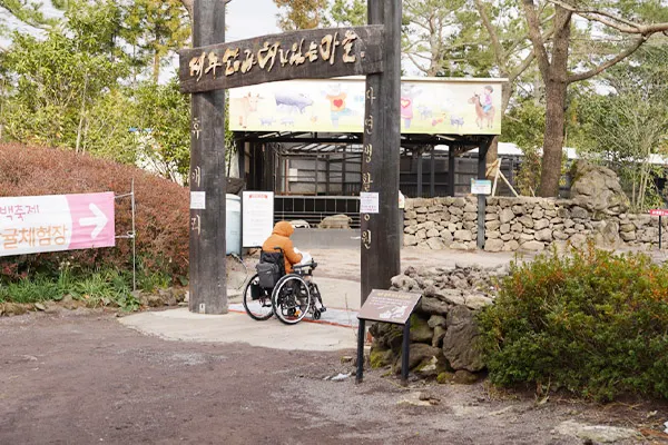 주출입구(접근로) : 매표소 앞 경사각도 10도, 길이 약 7미터의 오르막 경사가 있다. 휠체어 여행객은 비탈진 경사로 인해 위험할 수 있으니, 동행인과 함께 가는 것을 권장한다.