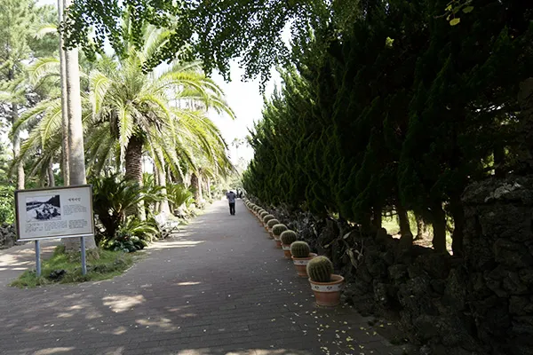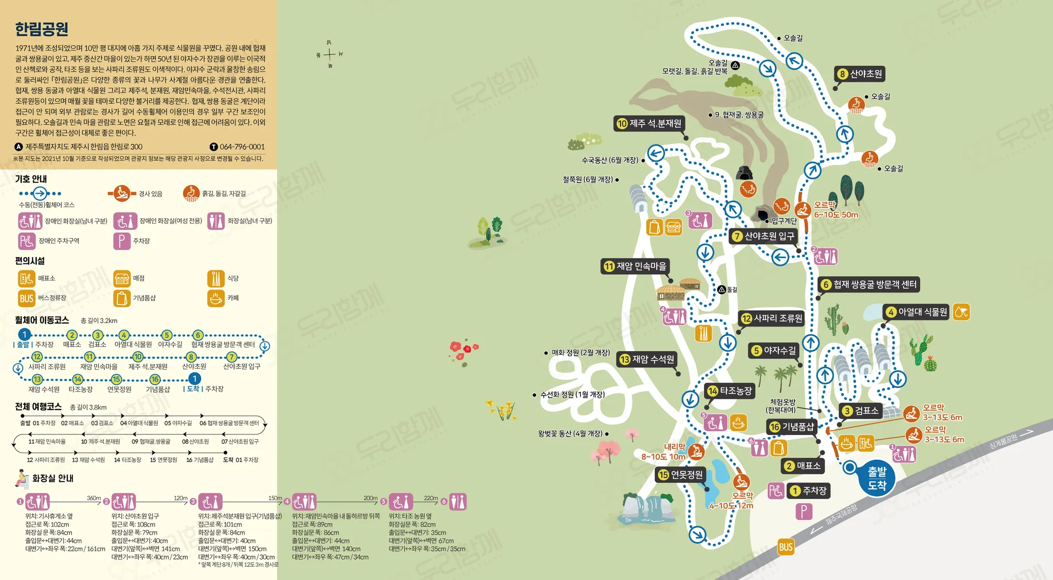 한림공원 주차장 → 매표소 → 검표소 → 아열대 식물원 → 야자수길 → 협재 쌍용굴 방문객 센터 → 산야초원 입구 → 산야초원 → 제주 석분재원 → 재암 민속마을 → 사파리 조류원 → 재암 수석원 → 타조농장 → 연못 정원 → 기념품 가게 → 주차장