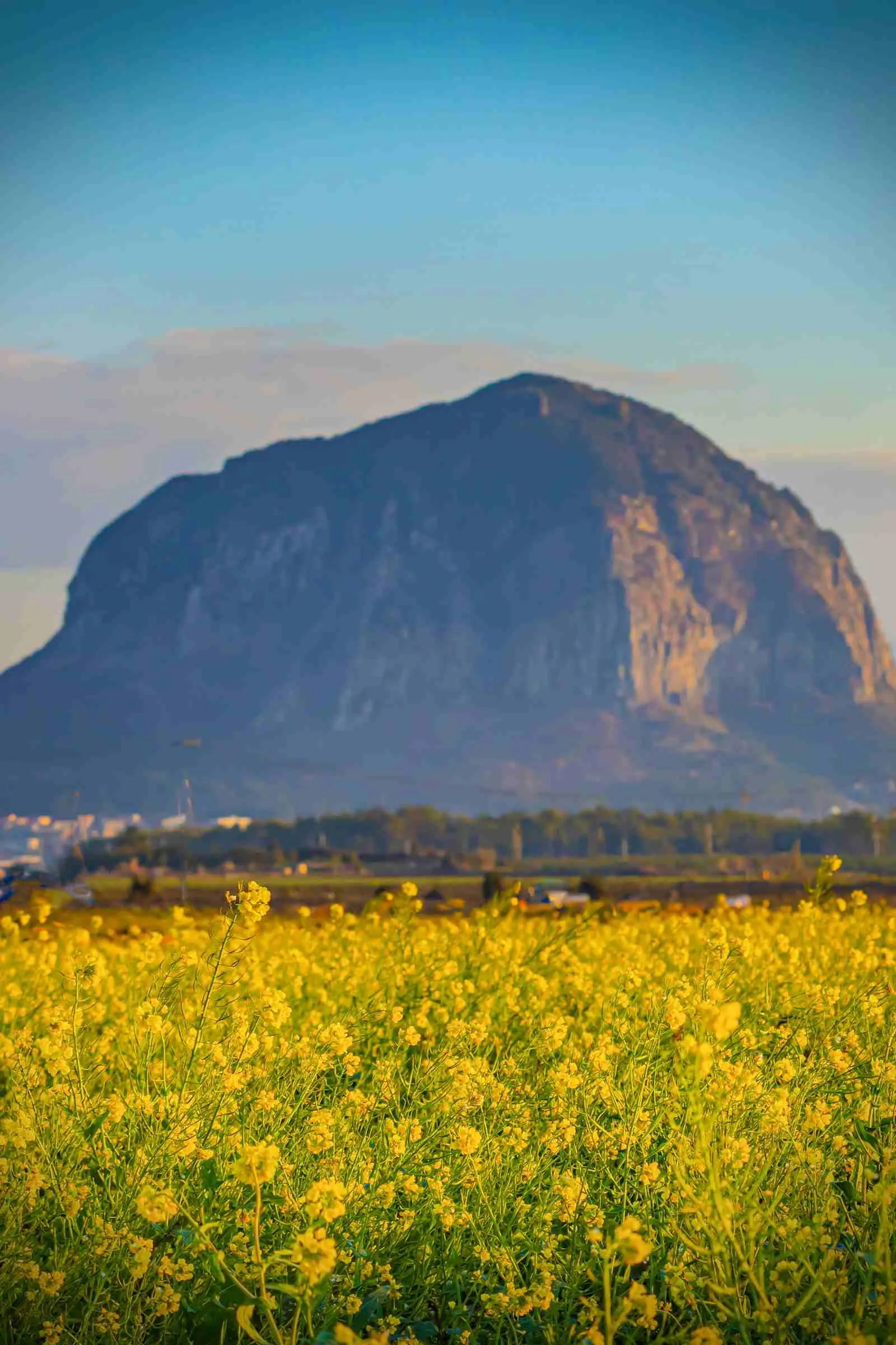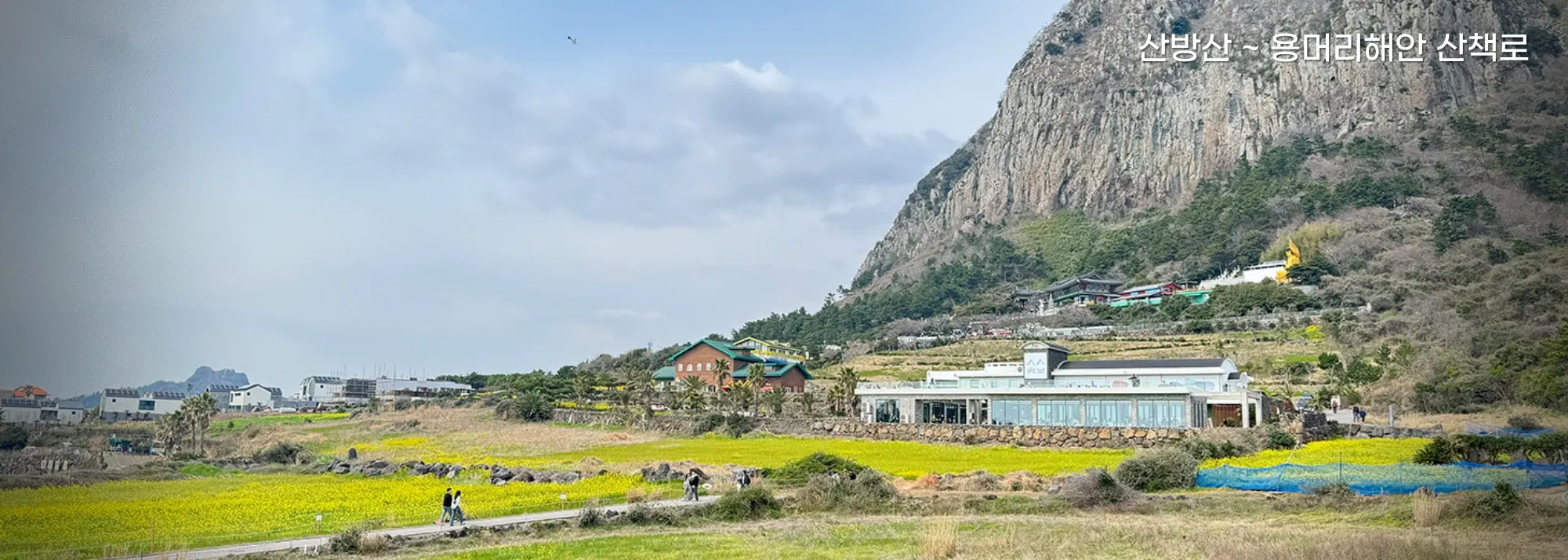 제주도 서귀포시에 있는 산방산은 오랜 세월 파도와 바람의 침식으로 만들어진 기암괴석과 해식동굴이 있는 곳입니다. 용이 바다로 뛰어드는 모습을 닮은 해안 절경으로, 검은색 용암암과 에메랄드빛 바다가 어우러져 장관을 이루는 곳입니다. 매년 2월~3월에는 산방산 주변 일대에 유채꽃이 만발하여 아름다운 풍경을 자랑합니다.