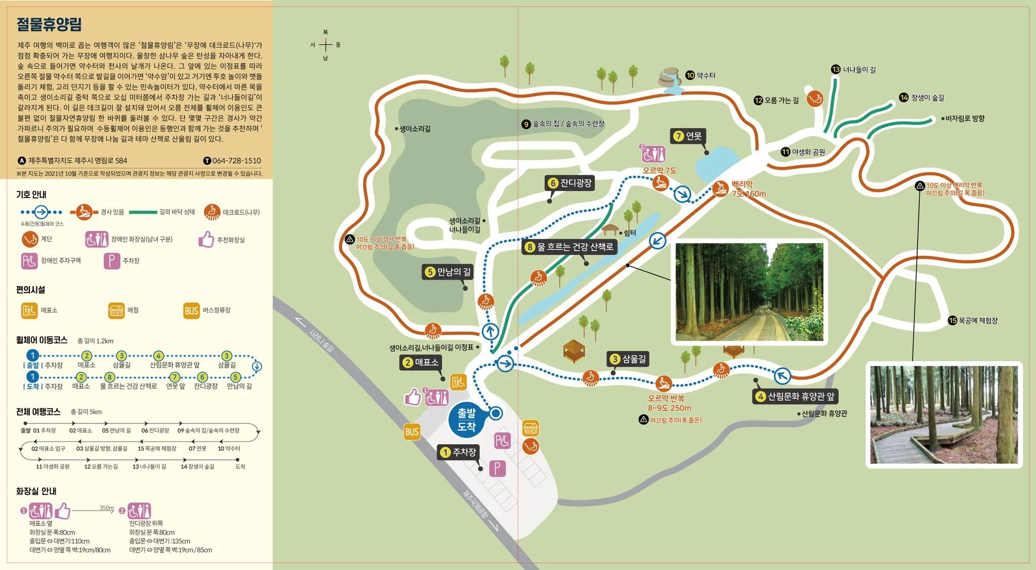 절물휴양림 주차장 → 매표소 → 만남의 길 → 잔디광장 → 숲속의 집/숲속의 수련장 → 약수터 → 연못 → 목공예 체험장 → 삼울길 방향, 삼울길 → 매표소 입구 → 야생화 공원 → 오름 가는 길 → 너나들이 길 → 장생이 숲길 → 주차장