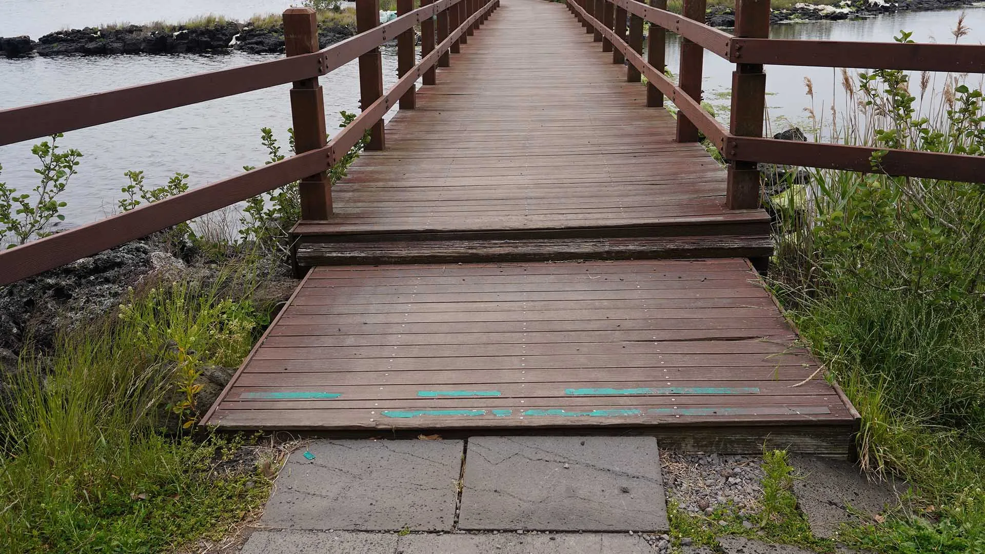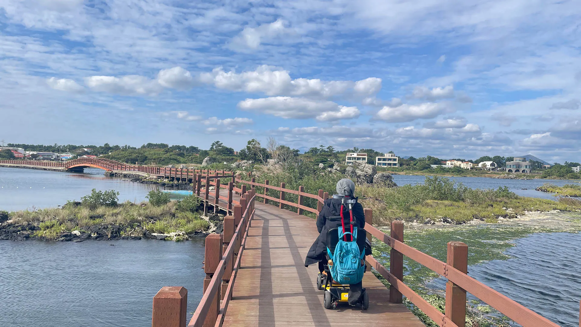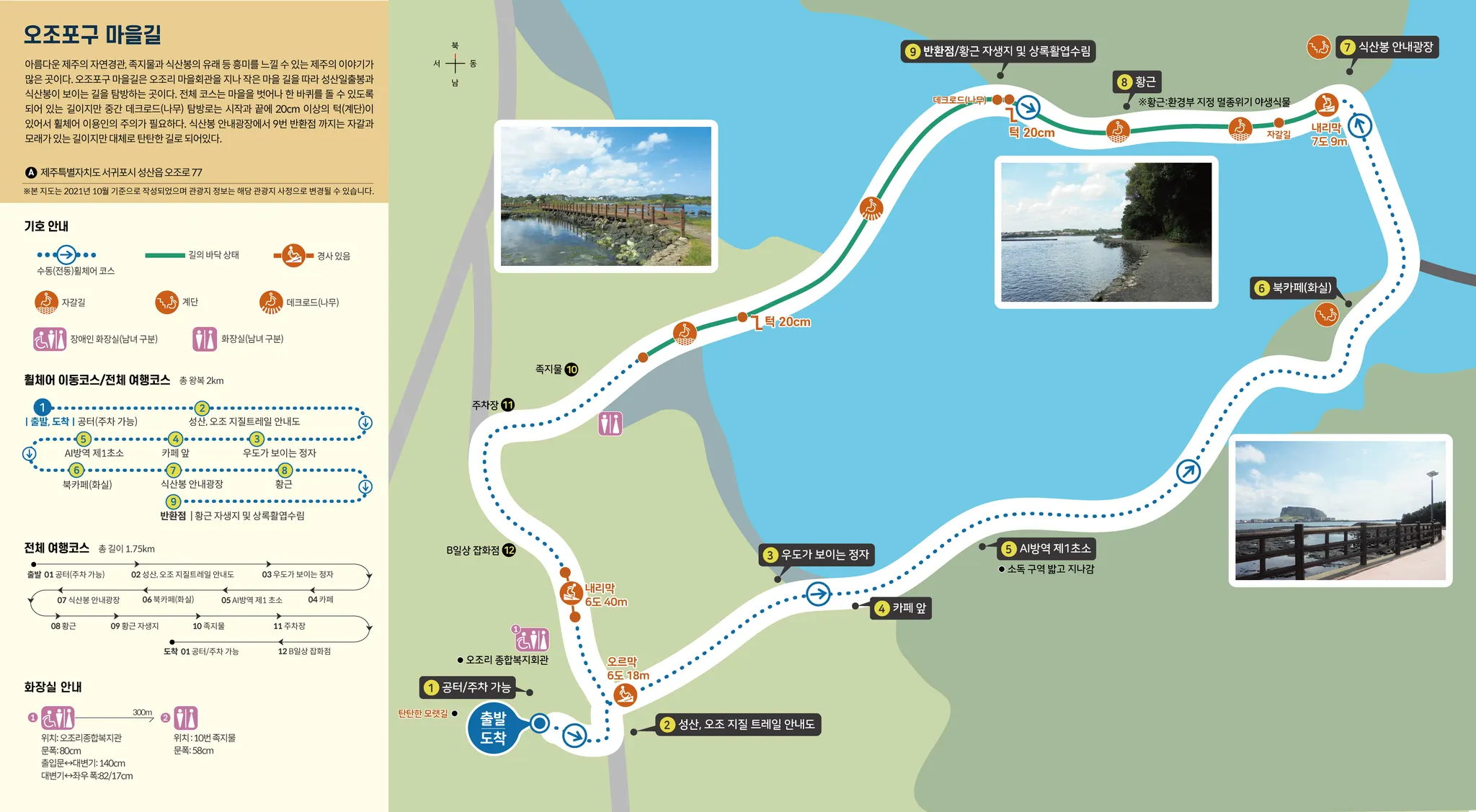 관람동선 : 오조포구 전체코스는 마을을 벗어나 한 바퀴를 돌 수 있도록 되어 있는 길이지만 식산봉으로 가는 중간 데크로드 접근로는 약5도의 경사로가 있으며, 데크로드로 가는 방면에는 돌길과 경사로 약12도로 되어 있으며 길은 탄탄한 모래길이다. 데크로드 시작과 끝 지점에는 20cm 이상의 단차가 있으므로 휠체어 이용인은 동반인의 이동지원이 필요한 구간이다.