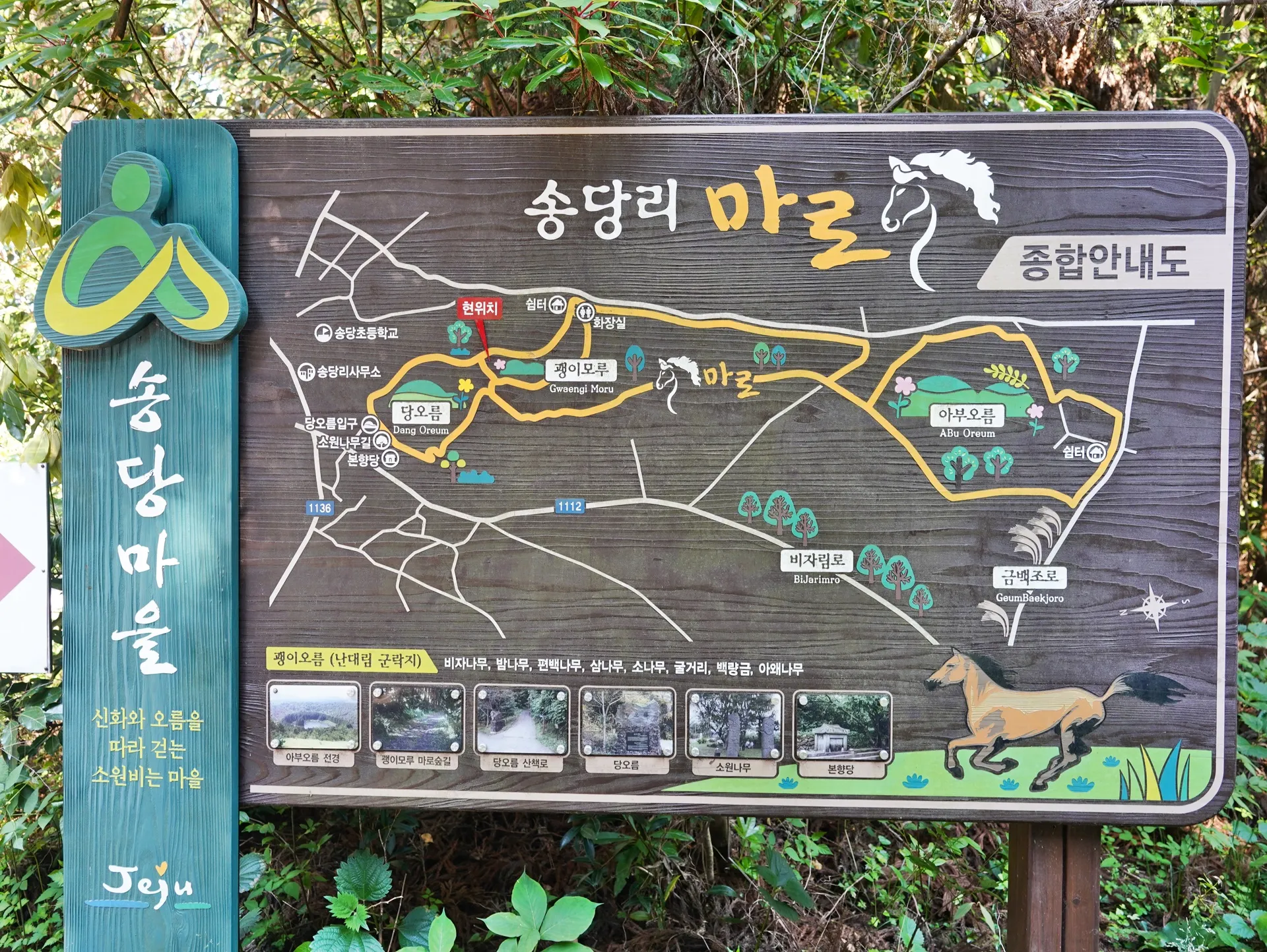 제주도 중산간에 자리 잡은 송당마을은 금백조 신화가 전해 내려오는 소원의 마을입니다. 마을 곳곳에는 소원을 빌 수 있는 소원비가 있으며, 소원길을 따라 걸으며 마을 돌담 사이로 들여다보면 평화로운 마을 분위기가 마음까지 차분하게 만들어줍니다. 송당마을 마로 산책길은 마을을 둘러싸고 있는 산책로로, 아름다운 마을 풍경과 함께 울창한 편백나무 숲을 감상할 수 있습니다. 편백나무는 피톤치드가 풍부하여 공기 정화 효과가 뛰어나며, 산림욕을 즐기기에 좋은 곳입니다.