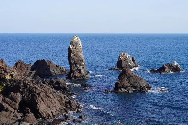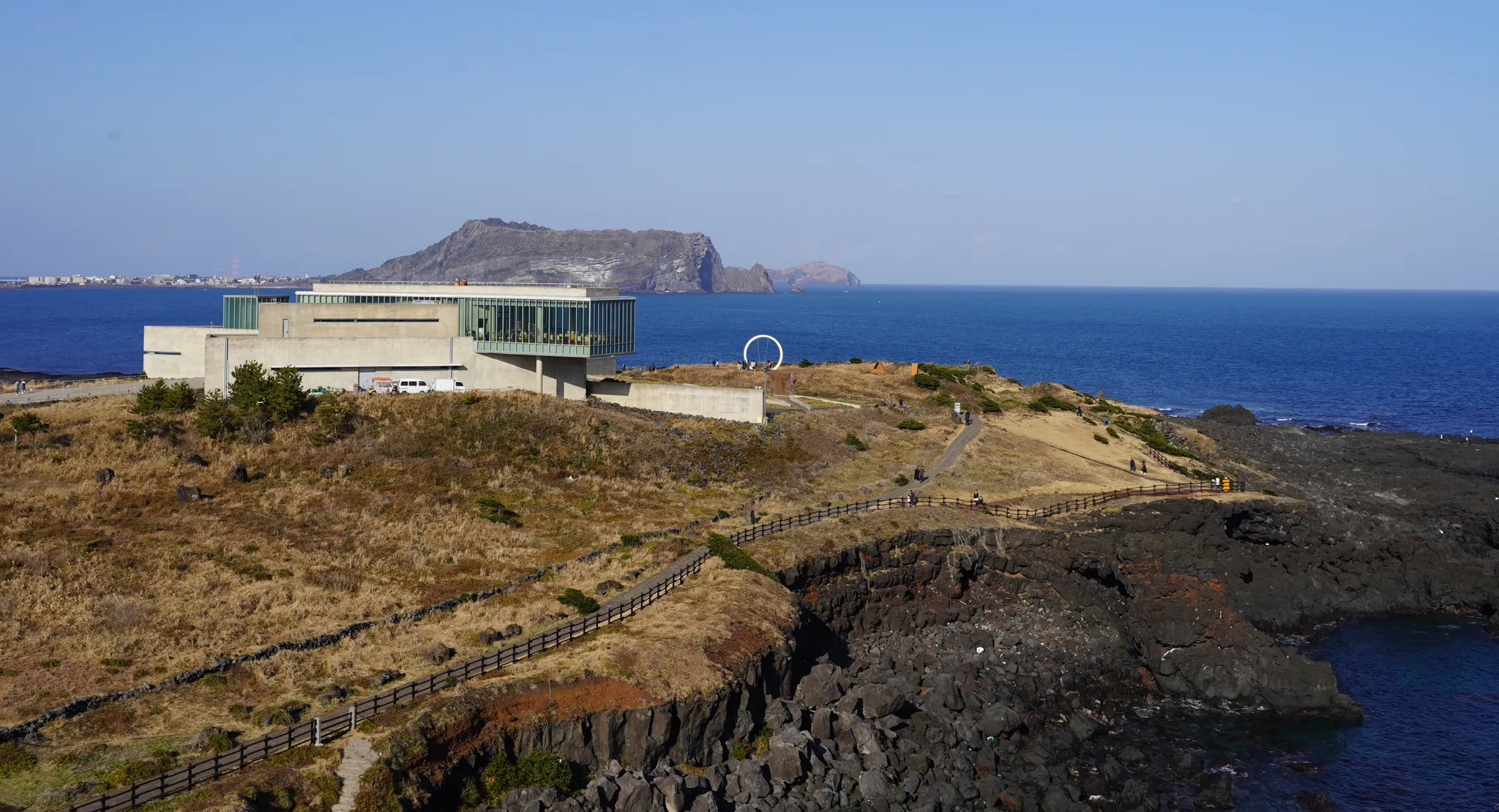 A : 제주도의 푸른 바다와 기암괴석, 그리고 한라산의 멋진 풍경을 한눈에 감상할 수 있는 아름다운 해안 절벽을 볼 수 있습니다.
