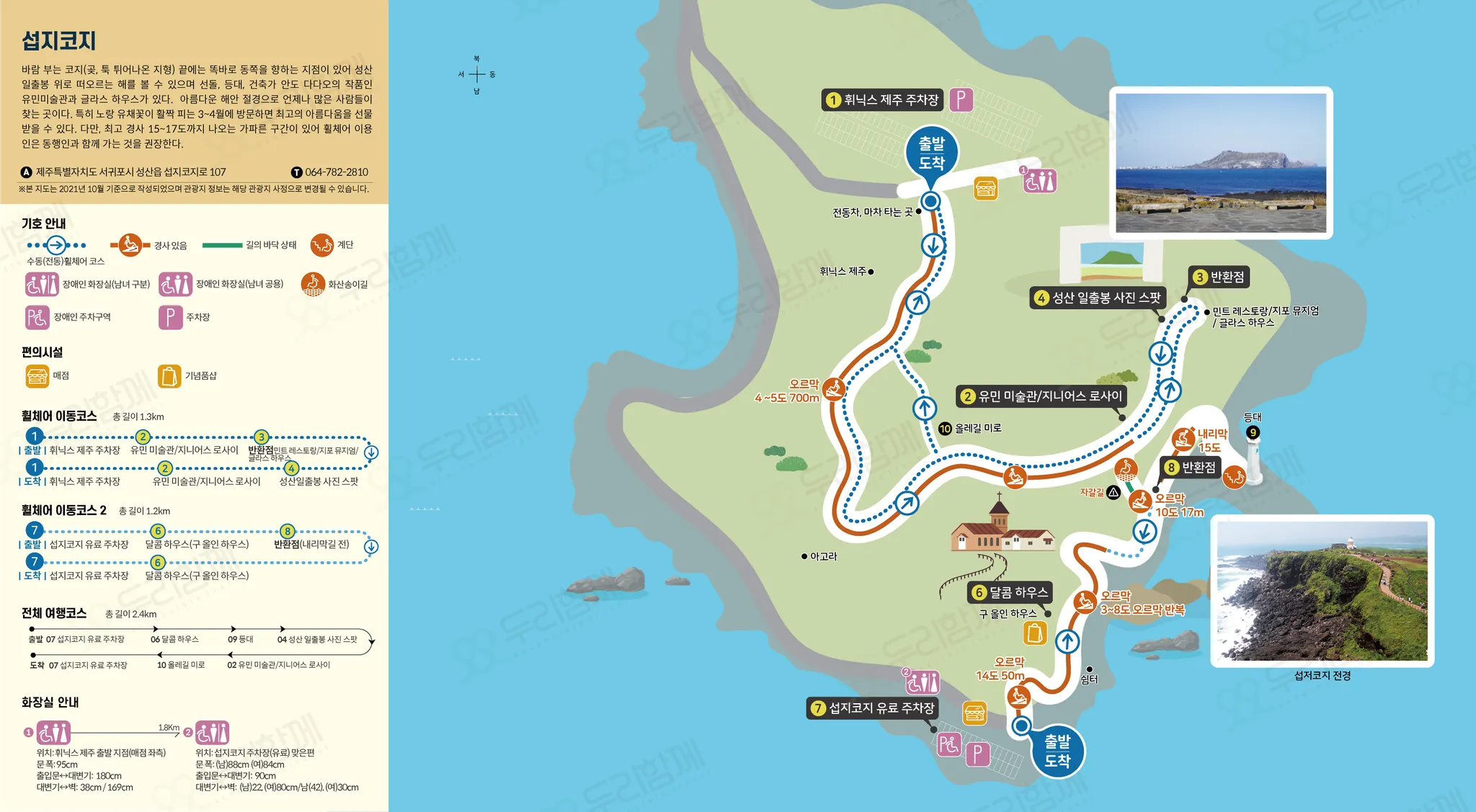 섭지코지 주차장 → 달콤하우스 → 등대 → 성산일출봉 사진 명소 → 유민 미술관지/지니어스 로사이 → 올레길 미로/반환 지점 → 섭지코지 주차장
